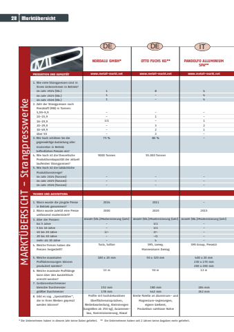 28Markt%u00fcbersichtMARKT%u00dcBERSICHT - StrangpresswerkePRODUKTION UND KAPAZIT%u00c4T1. Wie viele Strangpressen sind inIhrem Unternehmen in Betrieb?im Jahr 2024 (Stk.)im Jahr 2025 (Stk.)im Jahr 2026 (Stk.)2. Zahl der Strangpressen nach Presskraft (MN) in Tonnen:5,99-9,910-15,916-19,920-29,930-49,9%u00fcber 503. Wie hoch sch%u00e4tzen Sie die gegenw%u00e4rtige Auslastung aller momentan in Betrieb befind lichen Pressen ein?4. Wie hoch ist die theoretische Produktionskapazit%u00e4t der aktuelllaufenden Strangpressen?5. Wie hoch ist die tats%u00e4chliche Produktionsmenge?im Jahr 2024 (Tonnen)im Jahr 2025 (Tonnen)im Jahr 2026 (Tonnen)TECHNIK UND AUSSTATTUNG1. Wann wurde die j%u00fcngste Presse in Betrieb genommen?2. Wann wurde zuletzt eine Presse umfassend modernisiert?3. Alter der Pressen:bis 5 Jahre5 bis 10 Jahre10 bis 20 Jahre20 bis 30 Jahremehr als 30 Jahre4. Welche Firmen haben die Pressen hergestellt?5. Welche maximalen Profilabmessungen k%u00f6nnen produziert werden?6. Welche maximale Profill%u00e4nge kann %u00fcber den Ausziehtisch erreicht werden?7. Containerdurchmesserkleinster Durchmessergr%u00f6%u00dfter Durchmesser8. Gibt es sog. %u201eSpezialit%u00e4ten%u201c, die in Ihren Werken gepresst werden k%u00f6nnen?ITPANDOLFO ALLUMINIUM SPA**www.metall-markt.net444--121--2015Anzahl (Stk.)/Modernisierung (Jahr)---SMS Group, Presezzi400 x 20 mm230 x 170 mm200 x 200 mm12 m184 mm262 mmOTTO FUCHS KG**www.metall-markt.net8---1-32280 %55.000 Tonnen-20112020Anzahl (Stk.)/Modernisierung (Jahr)1/11/12/--/14SMS, Loewy,Mannesmann Demag50 x 320 mm50 m180 mm442 mmBreite Palette an Aluminium- undMagnesium-Legierungen, eigene Gie%u00dferei, Produktion nahtloser RohreDENORDALU GMBH*www.metall-markt.net111--1/1-75 %9000 Tonnen-20142000Anzahl (Stk.)/Modernisierung (Jahr)-1/---Turia, Sutton180 x 20 mm13 m152 mm178 mmProfile mit hochdekorativenOberfl%u00e4chenanspr%u00fcchen,Weiterbear bei tung, Kleinmengen(Losgr%u00f6%u00dfen ab 250 kg), Zu sam men -bau, Kom missionierung, EloxalDE* Die Unternehmen haben in diesem Jahr keine Daten geliefert. ** Die Unternehmen haben seit 2 Jahren keine Angaben mehr geliefert.