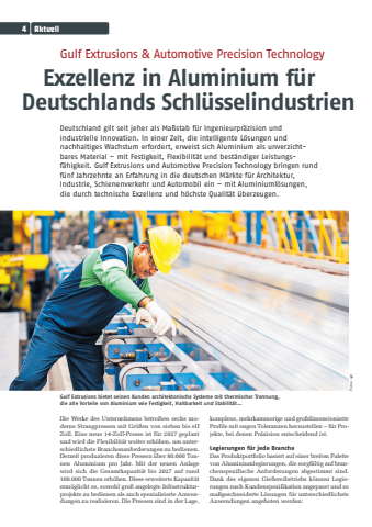 4Aktuell Exzellenz in Aluminium f%u00fcrDeutschlands Schl%u00fcsselindustrienGulf Extrusions & Automotive Precision TechnologyDeutschland gilt seit jeher als Ma%u00dfstab f%u00fcr Ingenieurpr%u00e4zision und industrielle Innovation. In einer Zeit, die intelligente L%u00f6sungen und nachhaltiges Wachstum erfordert, erweist sich Aluminium als unverzicht -bares Material %u2013 mit Festigkeit, Flexibilit%u00e4t und best%u00e4ndiger Leistungs -f%u00e4higkeit. Gulf Extrusions und Automotive Precision Technology bringen rundf%u00fcnf Jahrzehnte an Erfahrung in die deutschen M%u00e4rkte f%u00fcr Architektur,Industrie, Schienenverkehr und Automobil ein %u2013 mit Aluminiuml%u00f6sungen,die durch technische Exzellenz und h%u00f6chste Qualit%u00e4t %u00fcberzeugen.Die Werke des Unternehmens betreiben sechs moderne Strangpressen mit Gr%u00f6%u00dfen von sieben bis elfZoll. Eine neue 14-Zoll-Presse ist f%u00fcr 2027 geplantund wird die Flexibilit%u00e4t weiter erh%u00f6hen, um unterschiedlichste Branchenanforderungen zu bedienen.Derzeit produzieren diese Pressen %u00fcber 80.000 Tonnen Aluminium pro Jahr. Mit der neuen Anlagewird sich die Gesamtkapazit%u00e4t bis 2027 auf rund100.000 Tonnen erh%u00f6hen. Diese erweiterte Kapazit%u00e4term%u00f6glicht es, sowohl gro%u00df angelegte Infrastrukturprojekte zu bedienen als auch spezialisierte Anwendungen zu realisieren. Die Pressen sind in der Lage,komplexe, mehrkammerige und gro%u00dfdimensionierteProfile mit engen Toleranzen herzustellen %u2013 f%u00fcr Projekte, bei denen Pr%u00e4zision entscheidend ist.Legierungen f%u00fcr jede BrancheDas Produktportfolio basiert auf einer breiten Palettevon Aluminiumlegierungen, die sorgf%u00e4ltig auf branchenspezifische Anforderungen abgestimmt sind.Dank des eigenen Gie%u00dfereibetriebs k%u00f6nnen Legierungen nach Kundenspezifikation angepasst und soma%u00dfgeschneiderte L%u00f6sungen f%u00fcr unterschiedlichsteAnwendungen angeboten werden:Gulf Extrusions bietet seinen Kunden architektonische Systeme mit thermischer Trennung, die alle Vorteile von Aluminium wie Festigkeit, Haltbarkeit und Stabilit%u00e4t%u2026Fotos: apt