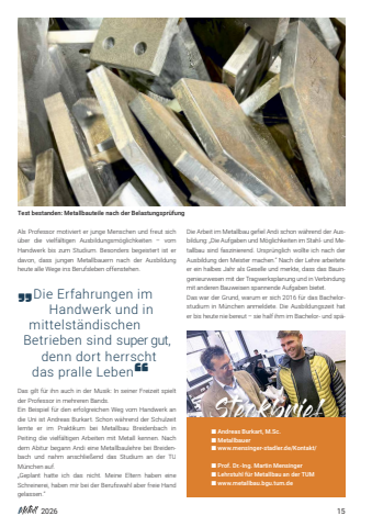202615Die Arbeit im Metallbau gefiel Andi schon w%u00e4hrend der Ausbildung: %u201eDie Aufgaben und M%u00f6glichkeiten im Stahl- und Metallbau sind faszinierend. Urspr%u00fcnglich wollte ich nach derAusbildung den Meister machen.%u201c Nach der Lehre arbeiteteer ein halbes Jahr als Geselle und merkte, dass das Bauingenieurwesen mit der Tragwerksplanung und in Verbindungmit anderen Bauweisen spannende Aufgaben bietet.Das war der Grund, warum er sich 2016 f%u00fcr das Bachelorstudium in M%u00fcnchen anmeldete. Die Ausbildungszeit hater bis heute nie bereut %u2013 sie half ihm im Bachelor- und sp%u00e4Als Professor motiviert er junge Menschen und freut sich%u00fcber die vielf%u00e4ltigen Ausbildungsm%u00f6glichkeiten %u2013 vomHandwerk bis zum Studium. Besonders begeistert ist erdavon, dass jungen Metallbauern nach der Ausbildungheute alle Wege ins Berufsleben offenstehen.%u201eDie Erfahrungen im Handwerk und in mittelst%u00e4ndischen Betrieben sind super gut,denn dort herrscht das pralle Leben%u201cDas gilt f%u00fcr ihn auch in der Musik: In seiner Freizeit spieltder Professor in mehreren Bands.Ein Beispiel f%u00fcr den erfolgreichen Weg vom Handwerk andie Uni ist Andreas Burkart. Schon w%u00e4hrend der Schulzeitlernte er im Praktikum bei Metallbau Breidenbach in Peiting die vielf%u00e4ltigen Arbeiten mit Metall kennen. Nachdem Abitur begann Andi eine Metallbaulehre bei Breidenbach und nahm anschlie%u00dfend das Studium an der TUM%u00fcnchen auf.%u201eGeplant hatte ich das nicht. Meine Eltern haben eineSchreinerei, haben mir bei der Berufswahl aber freie Handgelassen.%u201cSteckbriefnAndreas Burkart, M.Sc.nMetallbauernwww.mensinger-stadler.de/Kontakt/nProf. Dr.-Ing. Martin MensingernLehrstuhl f%u00fcr Metallbau an der TUM nwww.metallbau.bgu.tum.deTest bestanden: Metallbauteile nach der Belastungspr%u00fcfung
