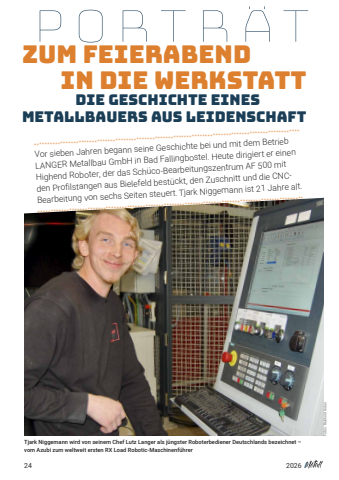 242026Zum Feierabend PORTRAT in die Werkstatt Die Geschichte eines Metallbauers aus Leidenschaft Vor sieben Jahren begann seine Geschichte bei und mit dem Betrieb LANGER Metallbau GmbH in Bad Fallingbostel. Heute dirigiert er einenHighend Roboter, der das Sch%u00fcco-Bearbeitungszentrum AF 500 mit den Profilstangen aus Bielefeld best%u00fcckt, den Zuschnitt und die CNCBearbeitung von sechs Seiten steuert.Tjark Niggemann ist 21 Jahre alt. **********************************************************************************************************************************************************************************************************Tjark Niggemann wird von seinem Chef Lutz Langer als j%u00fcngster Roboterbediener Deutschlands bezeichnet %u2013vom Azubi zum weltweit ersten RX Load Robotic-Maschinenf%u00fchrerFotos: Reinhold Kober