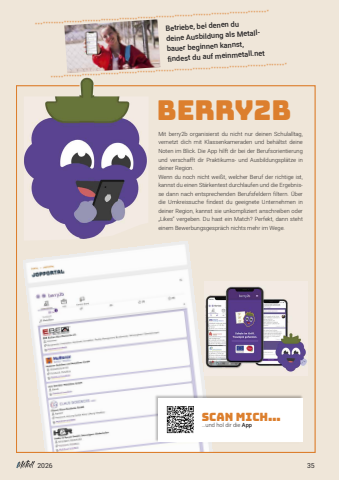 202635*****************************************************************************************Mit berry2b organisierst du nicht nur deinen Schulalltag,vernetzt dich mit Klassenkameraden und beh%u00e4ltst deineNoten im Blick. Die App hilft dir bei der Berufsorientierungund verschafft dir Praktikums- und Ausbildungspl%u00e4tze indeiner Region.Wenn du noch nicht wei%u00dft, welcher Beruf der richtige ist,kannst du einen St%u00e4rkentest durchlaufen und die Ergebnisse dann nach entsprechenden Berufsfeldern filtern. %u00dcberdie Umkreissuche findest du geeignete Unternehmen indeiner Region, kannst sie unkompliziert anschreiben oder%u201eLikes%u201c vergeben. Du hast ein Match? Perfekt, dann stehteinem Bewerbungsgespr%u00e4ch nichts mehr im Wege.berry2bScan Mich%u2026%u2026und hol dir die AppBetriebe, bei denen du deine Ausbildung als Metallbauer beginnen kannst, findest du auf meinmetall.net******************************************************************************************