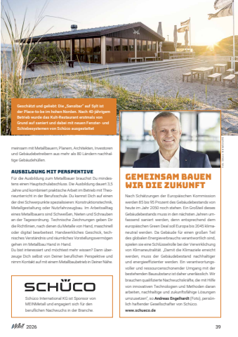 202639meinsam mit Metallbauern, Planern, Architekten, Investorenund Geb%u00e4udebetreibern aus mehr als 80 L%u00e4ndern nachhaltige Geb%u00e4udeh%u00fcllen.Ausbildung mit Perspektive F%u00fcr die Ausbildung zum Metallbauer brauchst Du mindestens einen Hauptschulabschluss. Die Ausbildung dauert 3,5Jahre und kombiniert praktische Arbeit im Betrieb mit Theorieunterricht in der Berufsschule. Du kannst Dich auf einender drei Schwerpunkte spezialisieren: Konstruktionstechnik,Metallgestaltung oder Nutzfahrzeugbau. Im Arbeitsalltageines Metallbauers sind Schwei%u00dfen, Nieten und Schraubenan der Tagesordnung. Technische Zeichnungen geben Dirdie Richtlinien, nach denen du Metalle von Hand, maschinelloder digital bearbeitest. Handwerkliches Geschick, technisches Verst%u00e4ndnis und r%u00e4umliches Vorstellungsverm%u00f6gengehen im Metallbau Hand in Hand.Du bist interessiert und m%u00f6chtest mehr wissen? Dann %u00fcberzeuge Dich selbst von Deiner beruflichen Perspektive undnimm Kontakt auf mit einem Metallbaubetrieb in Deiner N%u00e4he.Sch%u00fcco International KG ist Sponsor von MEINMetall und engagiert sich f%u00fcr den beruflichen Nachwuchs in der Branche.Gemeinsam bauenwir die ZukunftNach Sch%u00e4tzungen der Europ%u00e4ischen Kommissionwerden 85 bis 95 Prozent des Geb%u00e4udebestands vonheute im Jahr 2050 noch stehen. Ein Gro%u00dfteil diesesGeb%u00e4udebestands muss in den n%u00e4chsten Jahren umfassend saniert werden, denn entsprechend dem europ%u00e4ischen Green Deal soll Europa bis 2045 klimaneutral werden. Da Geb%u00e4ude f%u00fcr einen gro%u00dfen Teildes globalen Energieverbrauchs verantwortlich sind,spielen sie eine Schl%u00fcsselrolle bei der Verwirklichungvon Klimaneutralit%u00e4t. %u201eDamit die Klimaziele erreichtwerden, muss der Geb%u00e4udebestand nachhaltiger und energieeffizienter werden. Ein verantwortungsvoller und ressourcenschonender Umgang mit derbestehenden Bausubstanz ist daher unerl%u00e4sslich. Wirbrauchen qualifizierte Nachwuchskr%u00e4fte, die mit Hilfevon innovativen Technologien und Methoden daranarbeiten, nachhaltige und zukunftsf%u00e4hige L%u00f6sungenumzusetzen%u201c, so Andreas Engelhardt (Foto), pers%u00f6nlich haftender Gesellschafter von Sch%u00fcco.www.schueco.deGesch%u00e4tzt und geliebt: Die %u201eSansibar%u201c auf Sylt ist der Place-to-be im hohen Norden. Nach 40-j%u00e4hrigemBetrieb wurde das Kult-Restaurant erstmals vonGrund auf saniert und dabei mit neuen Fenster- undSchiebesystemen von Sch%u00fcco ausgestattetFoto: Sch%u00fcco International KGFoto: Architekturfotografie Bach/Sch%u00fcco International KG
