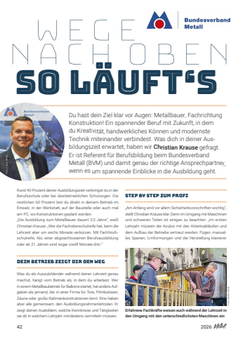422026Rund 40 Prozent deiner Ausbildungszeit verbringst du in derBerufsschule oder bei %u00fcberbetrieblichen Schulungen. Dierestlichen 60 Prozent bist du direkt in deinem Betrieb im Einsatz, in der Werkstatt, auf der Baustelle oder auch malam PC, wo Konstruktionen geplant werden.%u201eDie Ausbildung zum Metallbauer dauert 3,5 Jahre%u201c, wei%u00dfChristian Krause. %u201eWer die Fachoberschulreife hat, kann dieLehrzeit aber um sechs Monate verk%u00fcrzen. Mit Fachhochschulreife, Abi, einer abgeschlossenen Berufsausbildungoder ab 21 Jahren sind sogar zw%u00f6lf Monate drin.%u201c*******************************************************Dein Betrieb zeigt dir den Weg*******************************************************Was du als Auszubildender w%u00e4hrend deiner Lehrzeit genaumachst, h%u00e4ngt vom Betrieb ab, in dem du arbeitest. Wer in einem Metallbaubetrieb f%u00fcr Balkone startet, hat andere Aufgaben als jemand, der in einer Firma f%u00fcr Tore, Filmkulissen,Z%u00e4une oder gro%u00dfe Rahmenkonstruktionen lernt. Eins habenaber alle gemeinsam: den Ausbildungsrahmenlehrplan. Erzeigt deinen Ausbildern, welche Kenntnisse und T%u00e4tigkeitensie dir in welchem Lehrjahr mindestens vermitteln m%u00fcssen. *******************************************************Step by Step zum Profi*******************************************************%u201eAm Anfang sind vor allem Sicherheitsvorschriften wichtig%u201c,stellt Christian Krause klar. Denn im Umgang mit Maschinenund schweren Teilen ist einiges zu beachten. %u201eIm erstenLehrjahr m%u00fcssen die Azubis mit den Arbeitsabl%u00e4ufen unddem Aufbau der Betriebe vertraut werden. F%u00fcgen, manuelles Spanen, Umformungen und die Herstellung kleinererSo l%u00e4uft%u2018s WEGE NACH OBENDu hast dein Ziel klar vor Augen: Metallbauer, FachrichtungKonstruktion! Ein spannender Beruf mit Zukunft, in dem du Kreativit%u00e4t, handwerkliches K%u00f6nnen und modernste Technik miteinander verbindest. Was dich in deiner Aus bildungszeit erwartet, haben wir Christian Krause gefragt. Er ist Referent f%u00fcr Berufsbildung beim Bundesverband Metall (BVM) und damit genau der richtige Ansprechpartner,wenn es um spannende Einblicke in die Ausbildung geht.********************************************************************************************************************************************************************************************************************************Erfahrene Fachkr%u00e4fte weisen euch w%u00e4hrend der Lehrzeit inden Umgang mit den unterschiedlichsten Maschinen einFoto: Adobe StockFoto: Carina Reiter