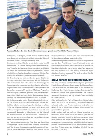 82026derholgenau zu fertigen%u201c, erz%u00e4hlt Fabian. Matthias f%u00fchrtunterdessen vor, wie ihnen ein schlicht wirkendes Rohr mitseitlichem Aufsatz als Biegevorrichtung dient. Ein anderes wird zum St%u00e4nder, um die Nieten wieder korrekteinzubringen. Die Technik verlangt den Auszubildenden einige Versuche ab. Was sind die richtige L%u00e4nge und St%u00e4rkeder Nieten, wie m%u00fcssen sie eingeschlagen werden? Genauigkeit ist hier gefragt und das Fachwissen der Meister. Nurso wird das Gel%u00e4nder originalgetreu wiederhergestellt. Mit Grundierung und Lack werden die guten St%u00fccke vorKorrosion gesch%u00fctzt. Matthias deutet auf rote Stellen amalten Gel%u00e4nderteil. Vor 120 Jahren ist Bleimennige alsRostschutzmittel verwendet worden. %u201eDas ist giftig. Deswegen wurden extra Frischlufthelme f%u00fcr das Schleifen undSchwei%u00dfen angeschafft%u201c, berichtet Matthias. Angenehmsind die, sagt er und meint grinsend: %u201eWie eine Klimaanlage am Kopf.%u201c Nach und nach finden die Auszubildenden einen Weg, um die Gel%u00e4nder wieder in Schuss zu bringen. Mit der Sanierung der ersten St%u00fccke ist es jedoch nicht getan. Sie m%u00fcssen ja auch an der Br%u00fccke angebracht werden.Matthias arbeitet bei der aufregenden Montage in luftigerH%u00f6he. Die schweren Gel%u00e4nder mit einem Kran an Ort undStelle zu transportieren f%u00e4llt aus, weil es zu teuer ist. Alsom%u00fcssen sich die Azubis einfallen lassen, wie die Teile aufdie Br%u00fccke kommen. Sie entwickeln eine Leichtbau-Konstruktion aus Aluminium, auf der ein Wagen f%u00e4hrt, der Gel%u00e4nder und Team transportiert. Mit Flaschenz%u00fcgen werden die Teile dann auf die richtigeH%u00f6he gezogen. Sie anzuschrauben, bedeutet Millimeterarbeit. Wie f%u00fcr einen Bungee Jump an Seilen gesichert, h%u00e4ngen die Windeck-Kollegen dabei %u00fcber dem Wasser, um dieBr%u00fcckengel%u00e4nder zu fixieren. Wer nicht schwindelfrei ist,f%u00fcr den ist diese Aufgabe garantiert nichts. Matthias ist begeistert, dass er so viel Neues ausprobierenund bei dem Projekt lernen kann. %u00dcberhaupt ist die abwechslungsreiche Arbeit der Grund, warum er sich f%u00fcr denStahlbau entschieden hat. %u201eHier ist jeden Tag was anderes%u201c, sagt Matthias und: %u201eVon Anfang an war hier eigenst%u00e4ndiges Arbeiten angesagt. Wir sind verantwortlich f%u00fcrdas, was wir abliefern.%u201c Stolz auf das gemeisterte ProjektDer Jung-Geselle ist sichtlich stolz auf jedes gemeisterteProjekt. Er genie%u00dft es, die Zeichnungen der Planer auf demTisch zu haben und sie umzusetzen %u2013 von Strichen undMa%u00dfen auf dem Papier hin zum fertigen Gel%u00e4nder, zu Vorbauten f%u00fcr D%u00e4cher oder ganze Fassaden. %u201eIm Stahlbauwerden die Dinge von 0 auf 100 gebracht%u201c, sagt sein Kollege Fabian dar%u00fcber. %u201eMan sollte auf jeden Fall nicht zwei linke H%u00e4nde haben,wenn man sich f%u00fcr die Ausbildung zum Metallbauer entscheidet. Mathe- und Physikverst%u00e4ndnis sind schon vonN%u00f6ten%u201c, findet er. %u201eEinfach ein schlaues K%u00f6pfchen sein%u201c, erg%u00e4nzt Matthias grinsend. Beide wollten nach der zehnten Klasse unbedingt insHandwerk, haben privat und in der Schule gern mit denH%u00e4nden gearbeitet. In welche Richtung genau es gehensollte, wussten die Jungs damals jedoch nicht. Es h%u00e4ttengenauso gut Holzverarbeitung oder Elektrotechnik werdenk%u00f6nnen. Also probierten sie sich in verschiedenen Praktikaaus. Das Probearbeiten bei Metallbau Windeck hat sieletztendlich %u00fcberzeugt. Auch das Studium der alten Konstruktionszeichnungen geh%u00f6rte zum Projekt Alte Plauener Br%u00fcckeFoto: Preuschoff